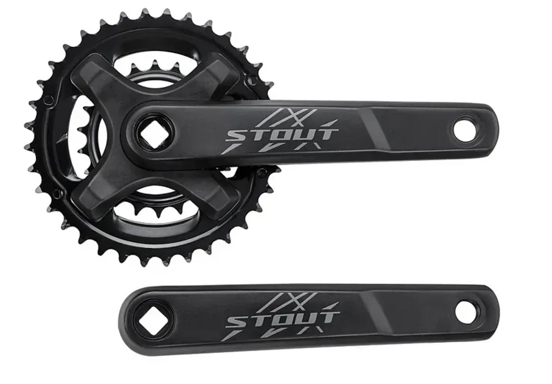 The Stout square-taper crankset is equipped with 36/22 tooth chainrings, making it suitable for 2x9 drivetrain systems.